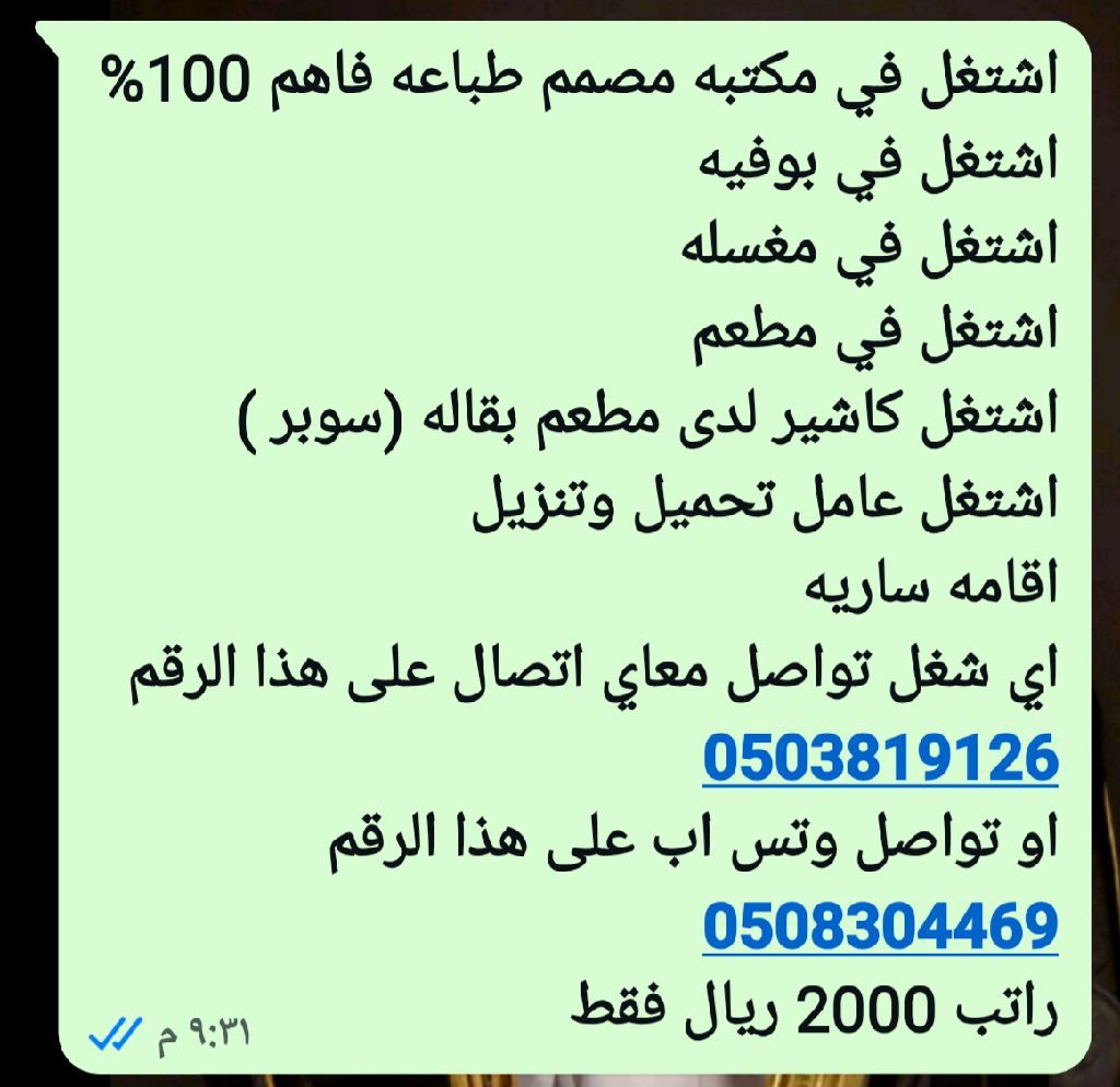 اشتغل في مكتبه مصمم طباعة فاهم 100% اشتغل في بوفيه اشتغل في مغسلة اشتغل في مطعم اشتغل كاشير لدى مطعم بقالة (سوبر) اشتغل عامل تحميل وتنزيل إقامة سارية أي شغل تواصل معي اتصال على هذا الرقم أو تواصل واتساب على هذا الرقم راتب 2000 ريال