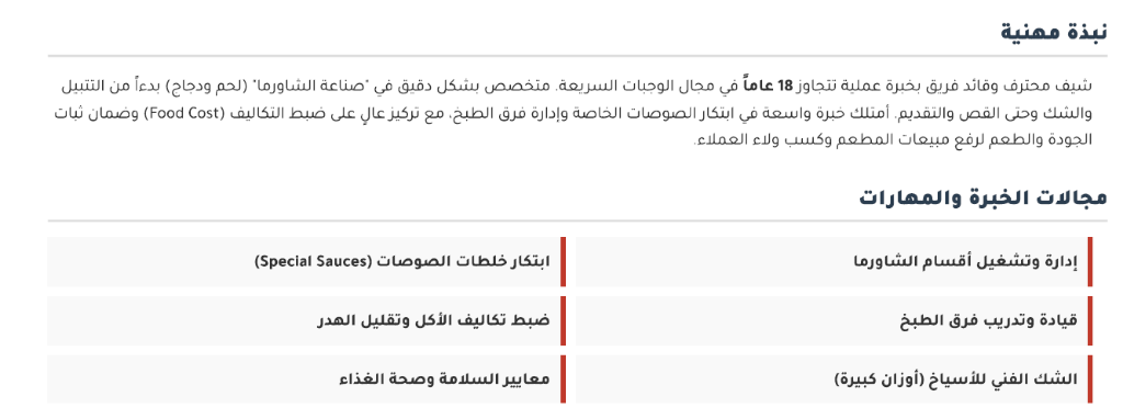شيف محترف وقائد فريق بخبرة عملية تتجاوز 18 عاما في مجال الوجبات السريعة. متخصص بشكل دقيق في "صناعة الشاورما" لحم ودجاج) بدءا من التتبيل والشك وحتى القص والتقديم. امتلك خبرة واسعة في ابتكار الصوصات الخاصة وإدارة فرق الطبخ، مع تركيز عال على ضبط التكاليف (Food Cost) وضمان ثبات الجودة والطعم لرفع مبيعات المطعم وكسب ولاء العملاء