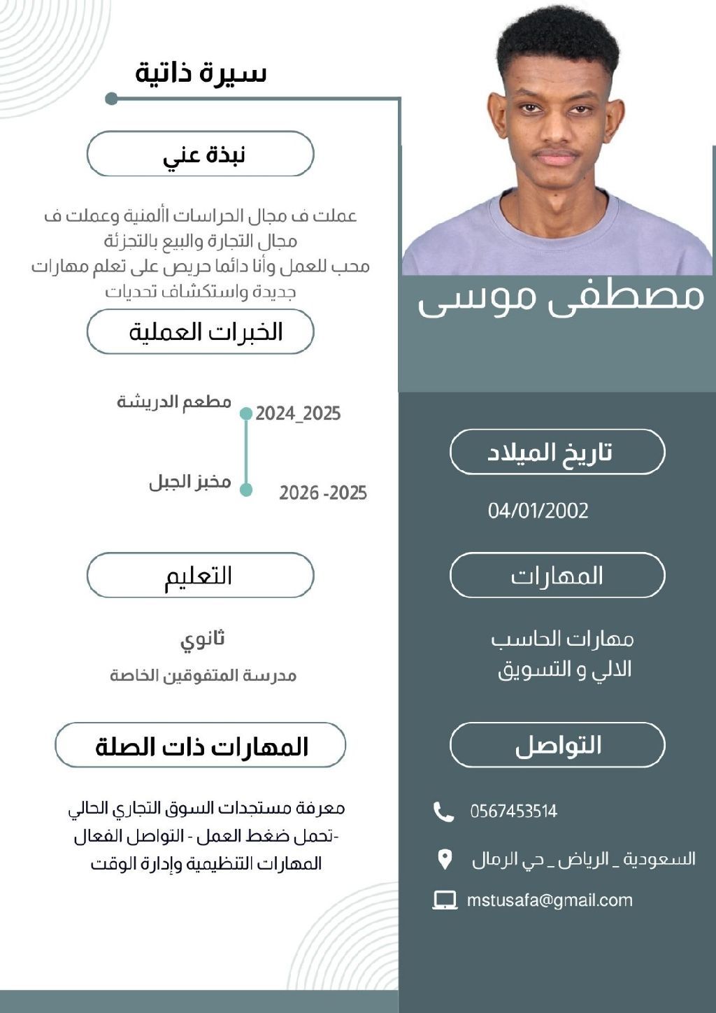 سوداني الجنسية العمر 24 أقامه سارية عملت في مجال الحراسات الأمنية وعملت في مجال التجارة والبيع بالتجزيه. محب للعمل. وأنا دائما حريص على تعلم مهارات جديدة واستكشاف تحديات