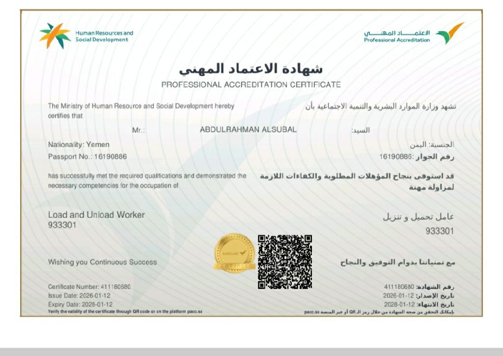 عامل يمني الجنسية جامعي وحاصل علي شهادة من الاعتماد المهني إقامة سارية ومجددة