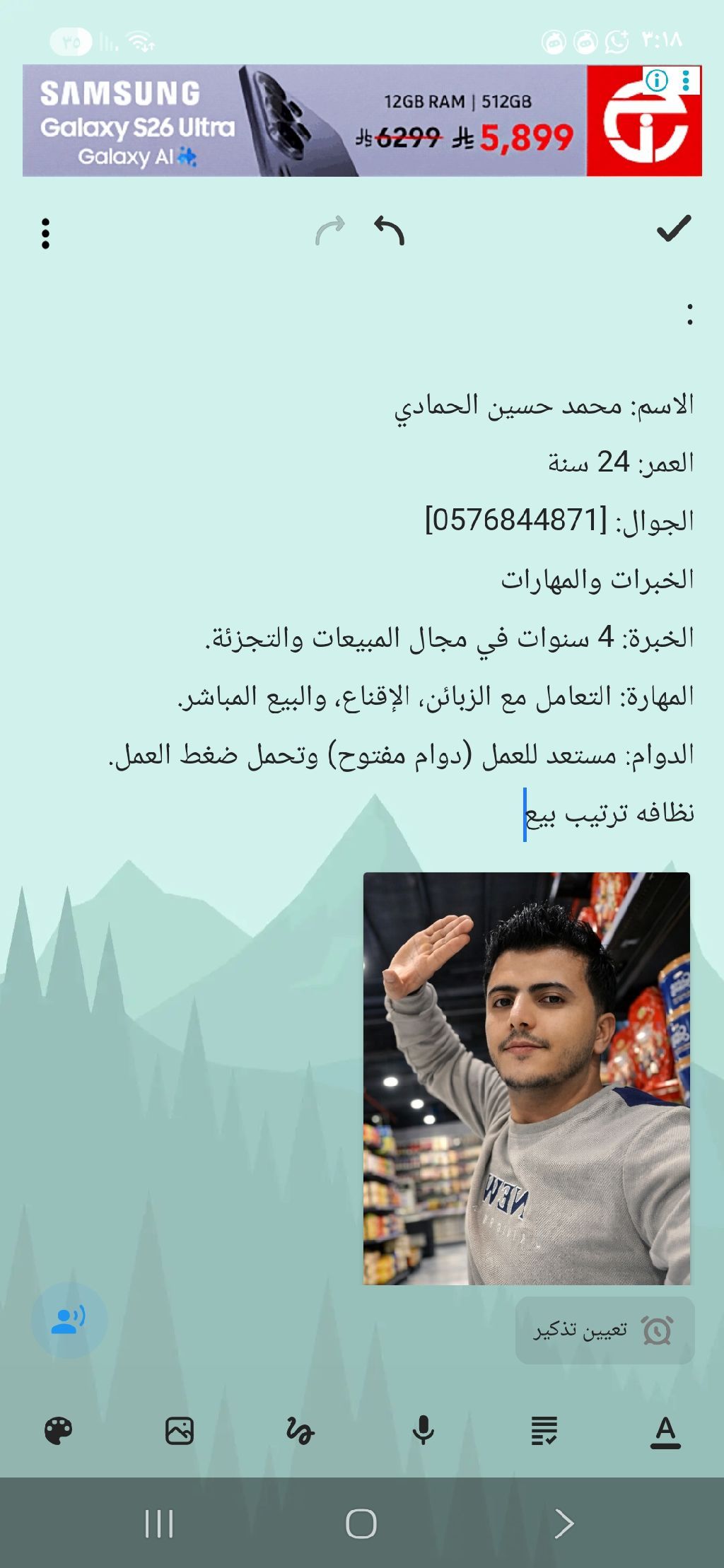 الاسم محمد حسين الحمادي العمر 24 سنة الجوال ضع رقمك هنا الخبرات والمهارات الخبرة 4 سنوات في مجال المبيعات والتجزئة. المهارة التعامل مع الزبائن، الاقناع، والبيع المباشر. الدوام مستعد للعمل (دوام مفتوح) وتحمل ضغط العمل. لماذا أنا شاب نشيط ومنضبط في المواعيد. خبرة كافية في إدارة المحل والتعامل مع البضائع. القدرة على العمل لفترات طويلة والالتزام التام. نصيحة لمحمد بما أن المفاصل