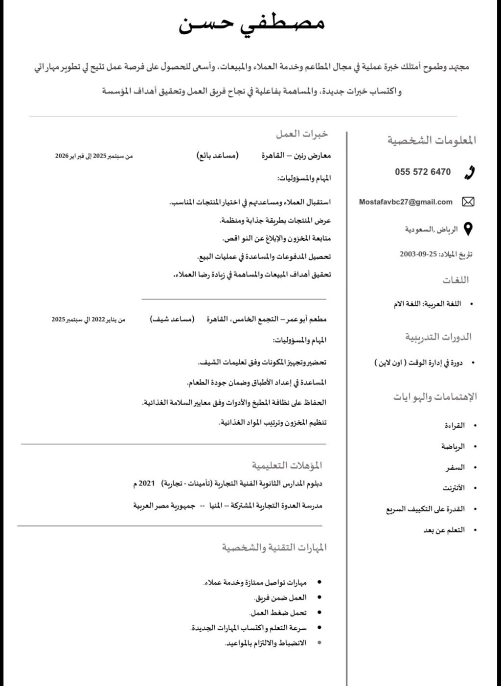مصري مقيم في الرياض 22 سنة لدي اقامة سارية لمدة عام المهنة عامل تحميل وتنزيل لدي خبرة في العمل كمساعد في مجال المطاعم ومعارض الأدوات المنزليه أرغب في العمل في أي مجال لاكتساب الخبرة