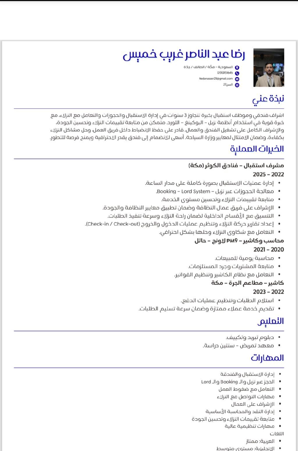 He devoted himself to work now to moving to any city experienced in hotels, including guest, cashier, food, and direct, I worked in all this field with all effort and efficiency, a valid stay