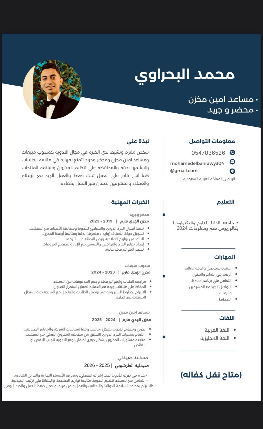 أنا محمد عندي 23 سنة خبرة 5 سنوات في مخازن الادوية وسنة مساعد صيدلي وسنة مندوب ادوية
