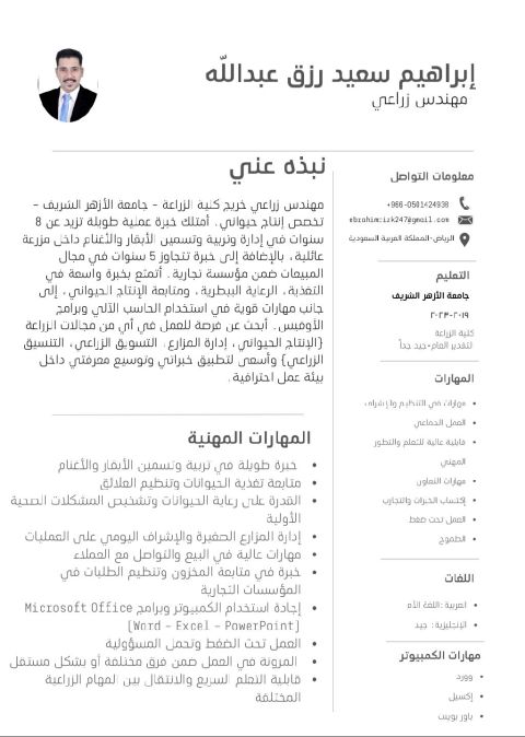 مهندس زراعي بخبرة عملية في المجال الزراعي والاداري تشمل المتابعة والاشراف، المبيعات والتسويق، وإدارة الأعمال اليومية. أتميز بقدرتي العالية على التعلم السريع والتكيف مع بيئات العمل المختلفة، اضافة الى امتلاكي رخصة قيادة وإقامة سارية