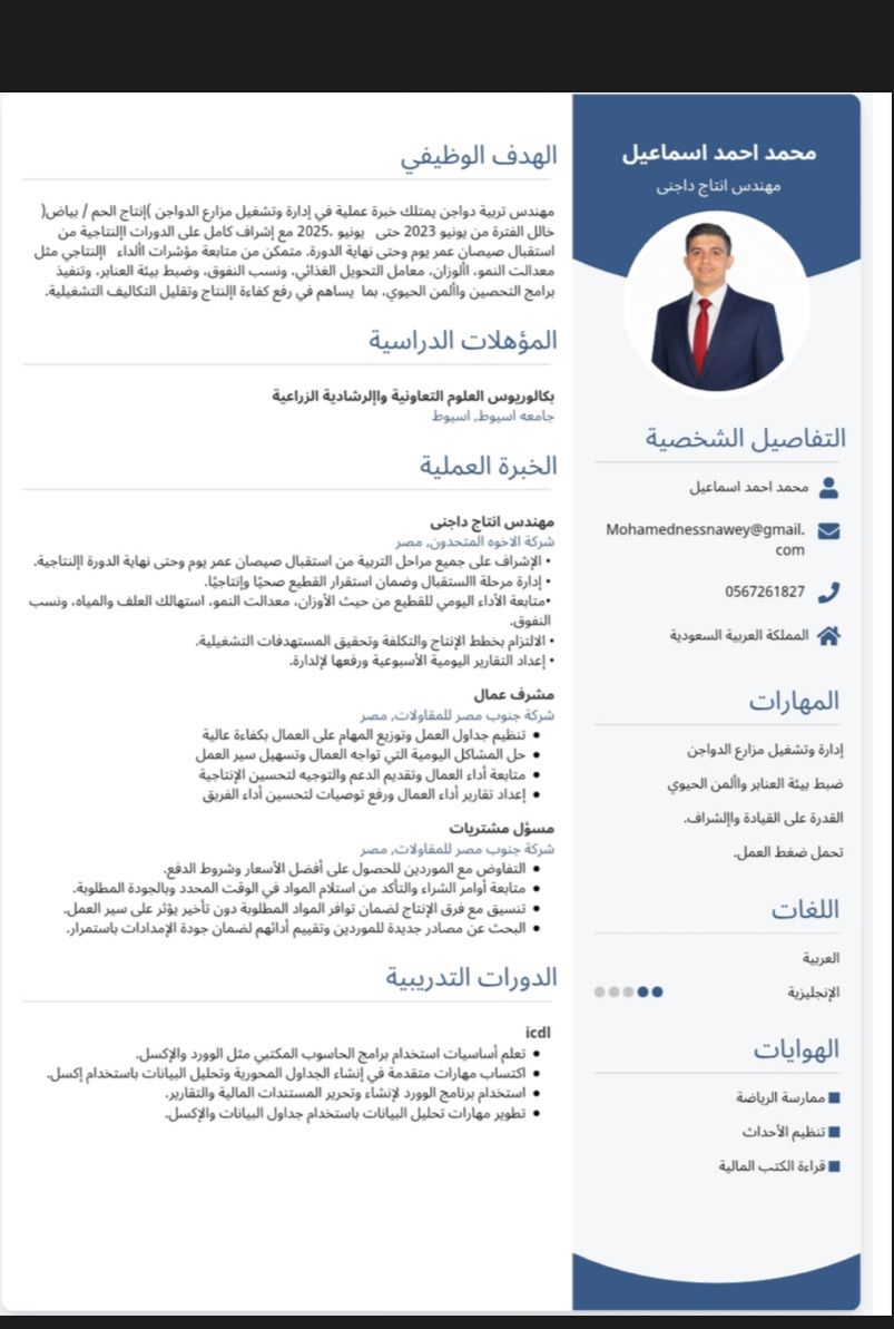 مهندس زراعي في مجال الدواجن حاصل علي بكالوريوس زراعة من جامعة أسيوط وسبق لي أن عملت كمهندس زراعي في مصر محتاج شغل مقيم في القصيم ومتوفر في معظم أنحاء المملكة العربية السعودية