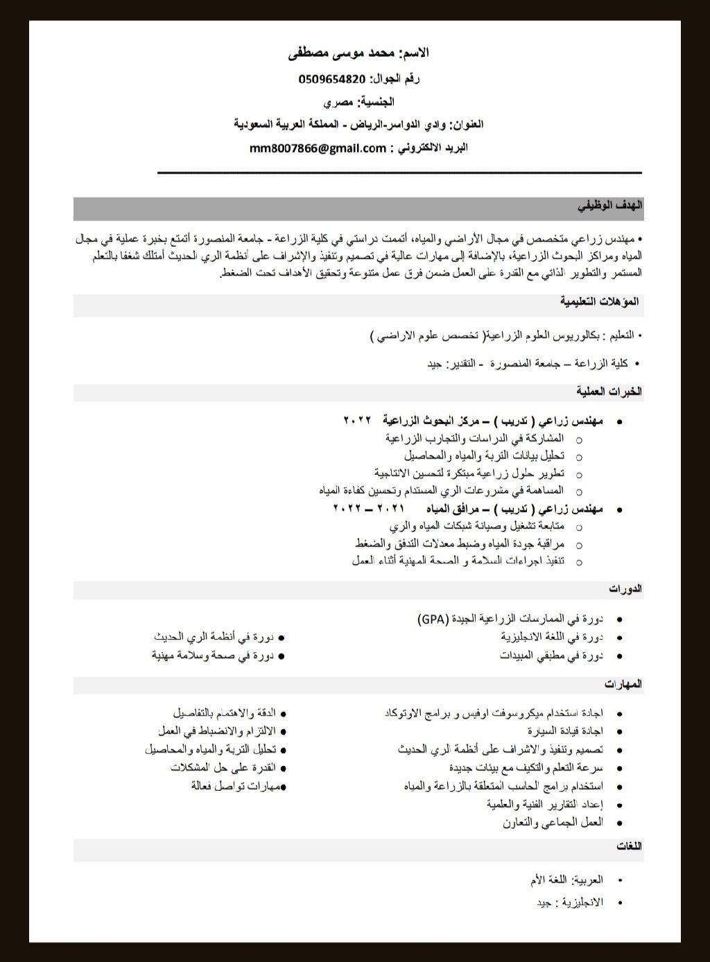 مهندس زراعي "قسم علوم الأراضي والمياه، ابحث عن عمل