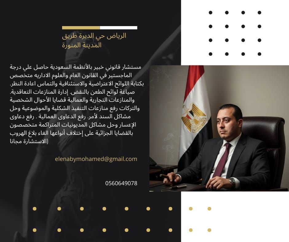 مستشار قانوني خبير بالأنظمة السعودية حاصل علي درجة الماجستير في القانون العام والعلوم الاداريه متخصص بكتابة اللوائح الاعتراضية والاستئنافية والتماس اعادة النظر. صياغة لوائح الطعن بالنقض. إدارة المنازعات التعاقدية. والمنازعات التجارية. والعمالية. قضايا الأحوال الشخصية والتركات. رفع منازعات التنفيذ الشكلية والموضوعية وحل مشاكل السند لأمر. رفع الدعاوى العمالية. رفع دعاوى الإعسار وحل مشاكل المديونيات