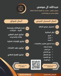 أقدم لكم خدمات التوثيق اصدار الوكالات وفسخها - وكالات مساجين وموقوفين - افراغ الصكوك العقارية الرهن وفكه وتعديله - توثيق عقود تأسيس الشركات توثيق الاقرارات المالية. أقدم لكم خدمات التسجيل العيني للعقارات 1 - نقل الملكية (حقوق - شركات) 2 - تسجيل العيني للعقار 3 - إدارة الحقوق والعقود والالتزامات (تقديم الخدمة في منطقة مكة المكرمة (جدة، مكة، الطائف)