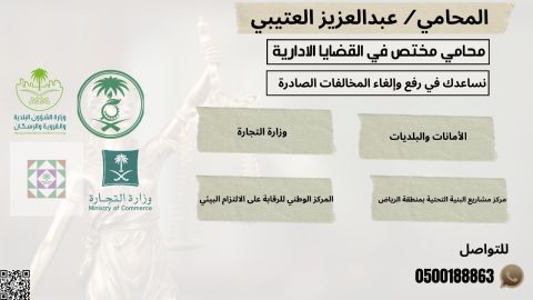 محام مختص في القضايا الادارية وجميع القضايا المتعلقة بطلب الغاء المخالفات والغرامات لدى الجهات الحكومية. نساعدك في رفع والغاء المخالفات الصادرة من الأمانات والبلديات - وزارة التجارة - مركز مشاريع البنية - الجهات الرقابية الأخرى كل ما عليك هو ارسال ملف المخالفة على رقم الواتساب، وسيتم مراجعة حالتك والرد عليك في أقرب وقت
