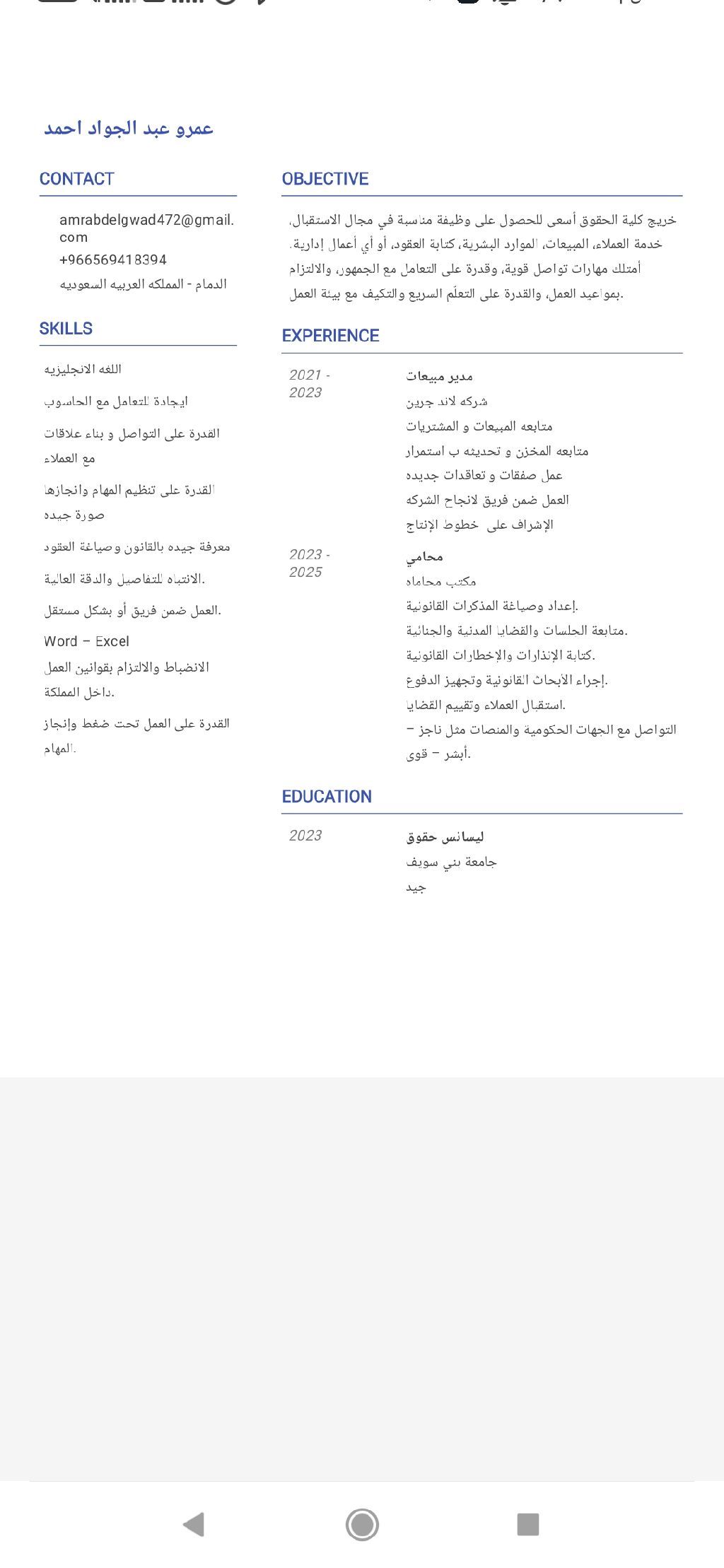 خريج حقوق ابحث عن فرصة عمل مناسبة داخل المملكة العربية السعودية. لدي قدرة عالية على التعلم السريع، والالتزام التام بالعمل، وتحمل ضغط العمل. أجيد التعامل مع العملاء، وتنظيم الملفات، واستخدام الحاسب الآلي وبرامج الأوفيس. أتميز بالجدية، والانضباط، وحسن التواصل، وأسعى لاكتساب خبرة عملية وتطوير مهاراتي والمساهمة بشكل ايجابي في جهة العمل