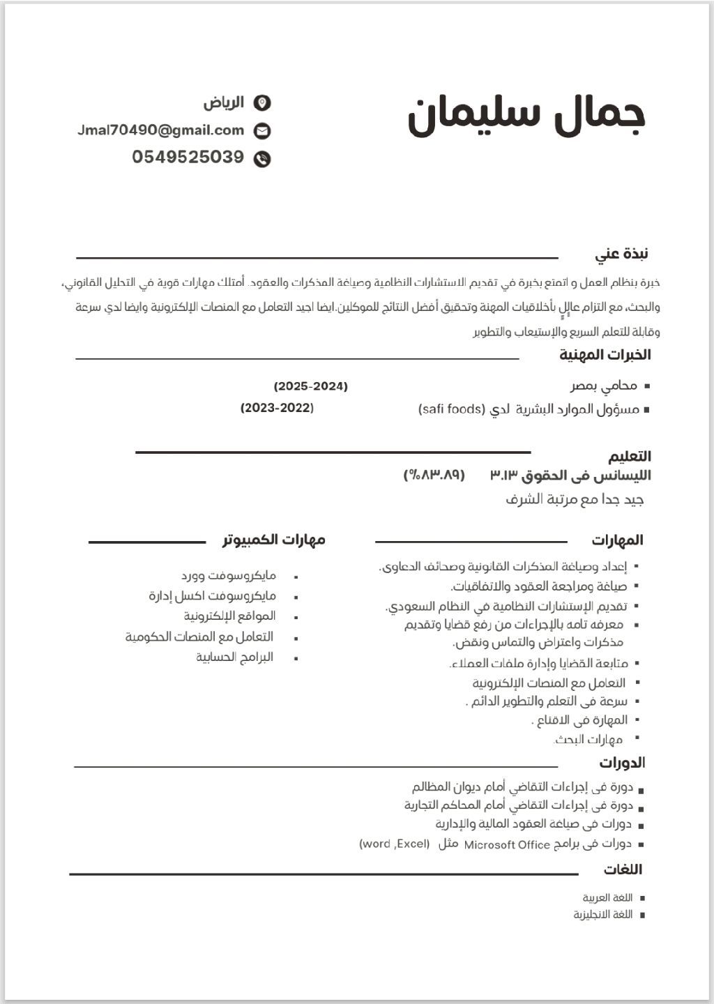 حاصل علي بكالوريوس قانون خبرة عامين بالمحاماة وخبرة عام في الموارد البشرية أجيد صياغة العقود والوثائق والاتفاقيات أمين ومنظم لبق في التعامل مع الموكلين وأتمتع بالحفاظ على أخلاقيات المهنة
