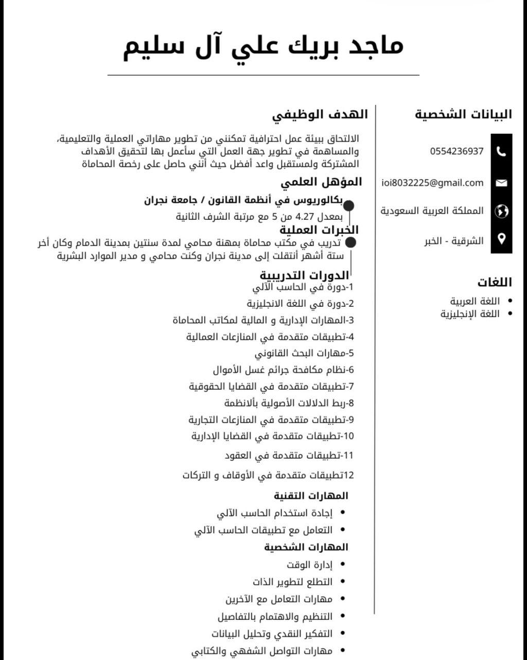 محامي مرخص تخصص (قانون) يبحث ويطمح للانضمام الى فريق عمل مميز والمساهمة في تحقيق أهداف شركة أو مكتب، وامتلك خلفية أكاديمية قوية وخبرة سابقة ثلاث سنوات، بالاضافة الى مهارات عملية اكتسبتها من خلال التدريب في مكتب محاماة والدورات)