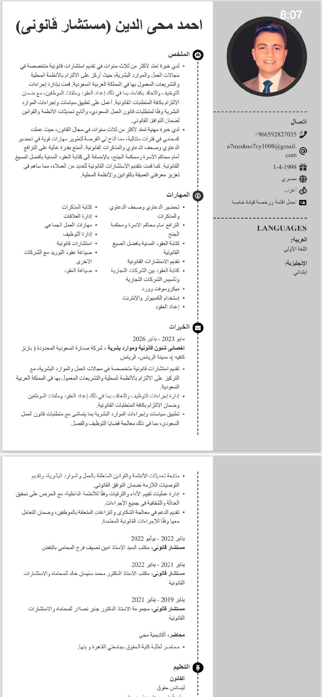 ابحث عن عمل - مستشار قانوني حاصل على ليسانس حقوق وماجستير في القانون العام والاقتصاد، امتلك خبرة في الأعمال القانونية قمت بالعمل في الشؤون القانونبة لشركة (بارنز للقهوة) لمدة 3 سنوات. وصياغة العقود واعداد المذكرات القانونية والمتابعة القانونية. أتميز بالالتزام والدقة وحسن التواصل وأسعى للحصول على فرصة عمل مناسبة داخل المملكة العربية السعودية