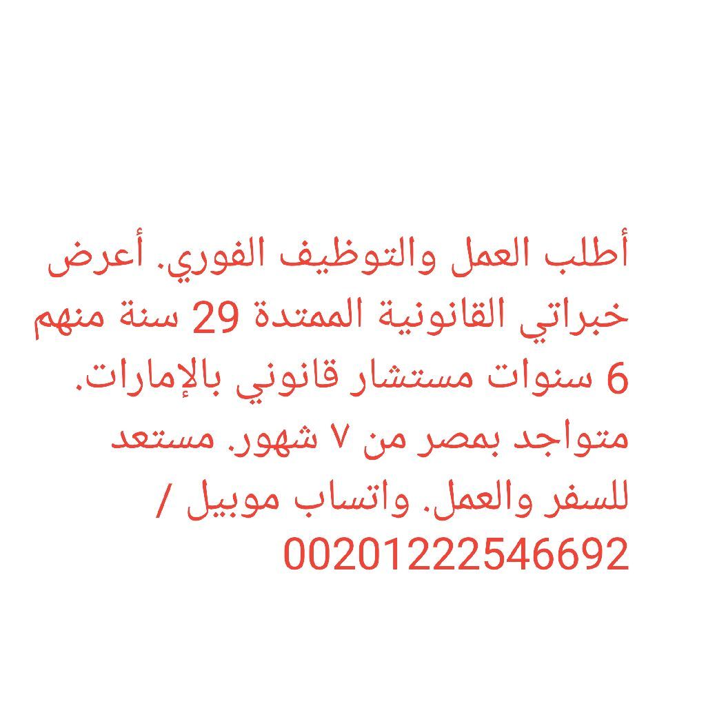 أطلب العمل والتوظيف الفوري. خبرة واحترافية قانونية طويلة جاوزت 29 سنة منهم 6 سنوات مستشار قانوني في الامارات. مستشار قانوني مصري. نقض. خبرة القوانين الاتحادية وتعديلاتها وقوانين إيجارات والملكية المشتركة دبي وأبو ظبي. مذكرات ولوائح وطعون وعقود ومنازعات الشركات والأفراد. خبرة شتي الدعاوي. نتائج ملموسة وتمثيل العملاء بكفاءة. أطلب العمل. مستعد للتواصل