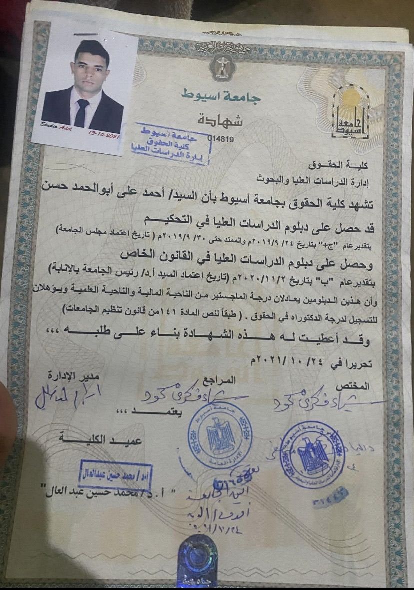 حاصل علي ليسانس حقوق وماجستير في القانون الخاص والتحكيم الدولي ابحث عن عمل محاماة