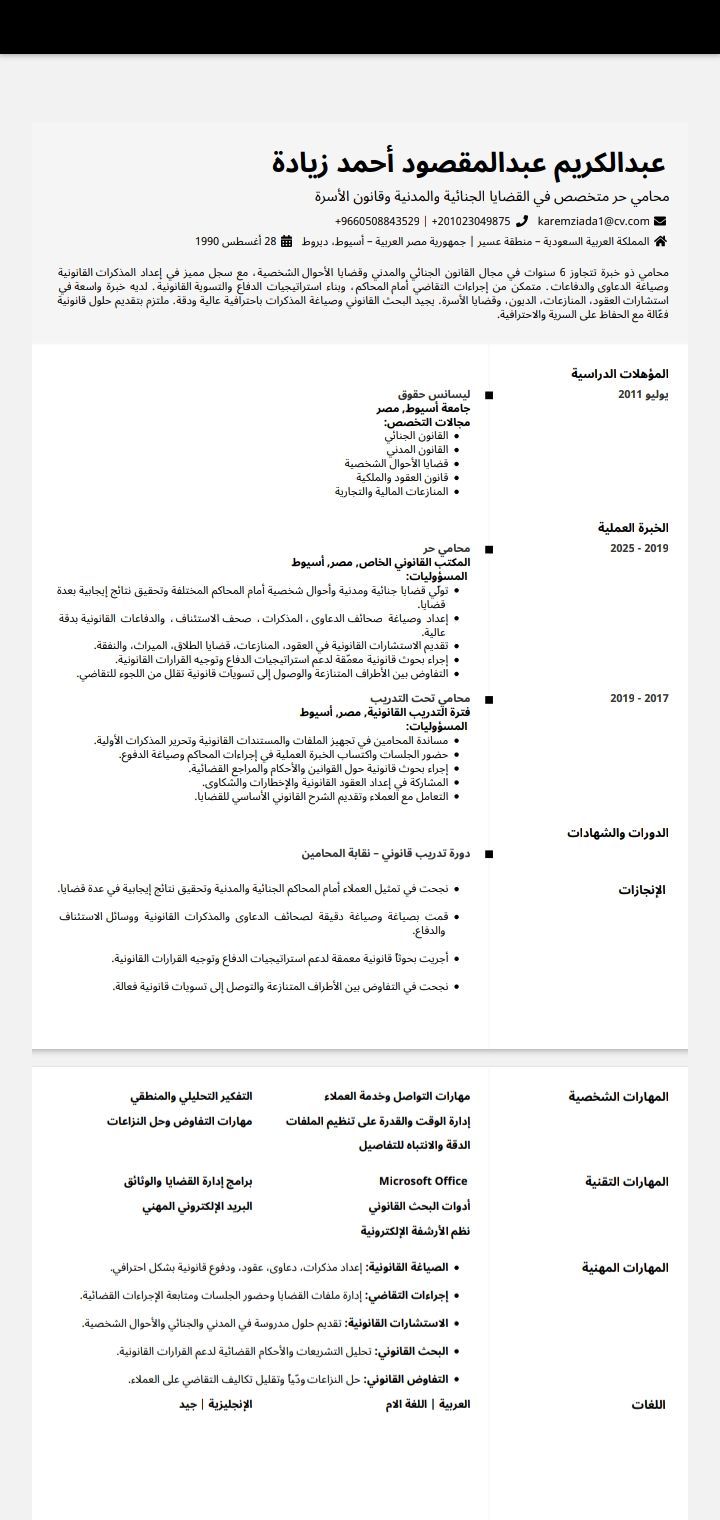 خبرة في مجال المحاماة والقانون بجمهورية مصر العربية لمدة سنتين تحت التدريب وخمس سنوات عمل مستقل ومتخصص في القانون المدني والقانون الجنائي وقانون الأحوال الشخصية