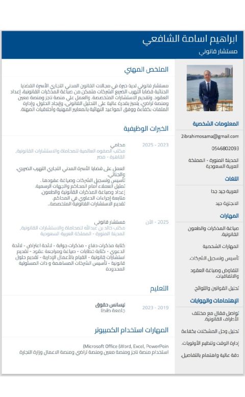 محامي مؤهل يتمتع بخبرة ومعرفة واسعة في الأنظمة القانونية، يسعى للانضمام الى جهة قانونية مرموقة لتقديم الاستشارات القانونية، مع الالتزام التام بأعلى معايير المهنية والنزاهة. أجيد العمل علي جميع المنصات الحكومية مثل ناجز وابشر ومقيم وقوي وإيجار وأيضا رفع الدعاوي أمام جميع المحاكم واعداد وصياغة المذكرات وصياغة العقود