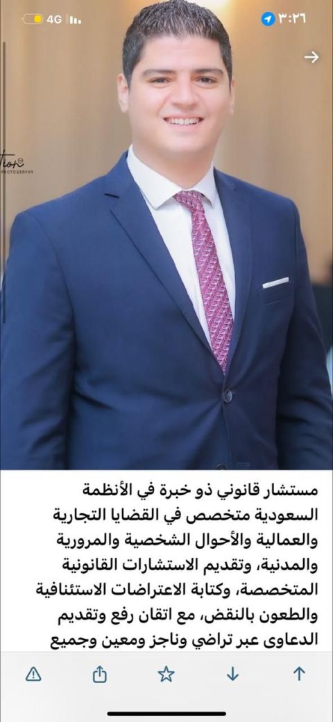 Professional Legal Consultant Specialized in Saudi Laws Expert in commercial, labor, personal status, traffic, and civil cases, specializing in providing precise legal consultations and drafting appeal and cassation petitions. Extensive experience in filing and submitting cases through Taraadi, Najiz, Moein, and all official legal platforms
