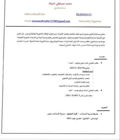الاسم/ محمد مصطفى خليفة. خريخ كلية حقوق جامعة مدينة السادات. بتقدير عام جيد. خبرة أكثر من عامين في مهنة المحاماة