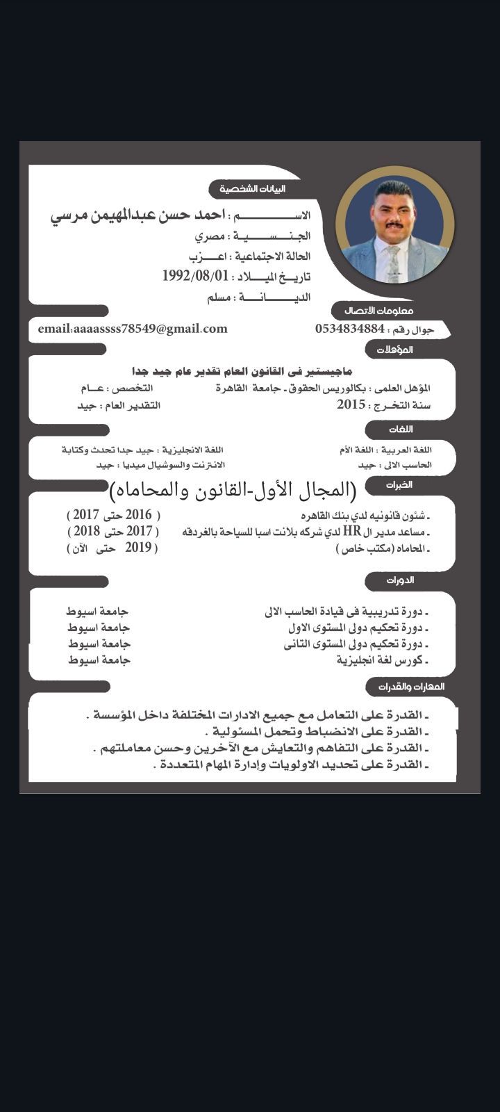 محامي ومستشار قانوني واداري ابحث عن وظيفة أو عمل في شركة أو مكتب للمحاماة والاستشارات القانونية والادارية. حاصل على ماجستير في القانون العام بتقدير عام جيد جدا. أتمتع بخبرة واسعة كمستشار قانوني واداري، حيث قمت بتقديم استشارات قانونية متكاملة للعملاء في مختلف المجالات. طورت استراتيجيات قانونية فعالة ساهمت في تحقيق نتائج ايجابية للعملاء في قضاياهم. عملت على تحليل القوانين واللوائح