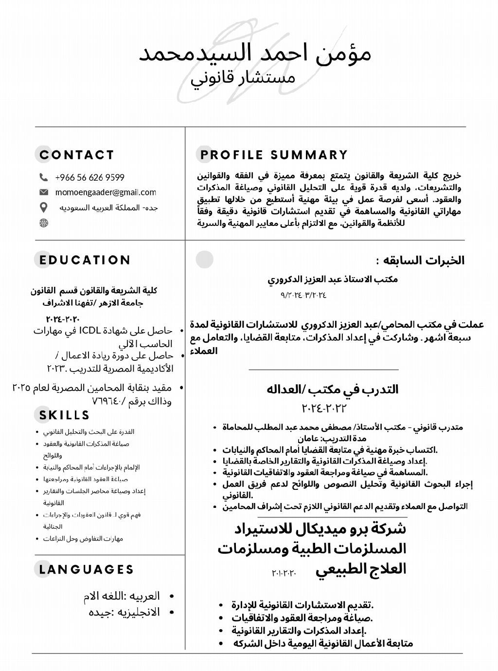 مؤمن أحمد خريج كلية شريعة وقانون جامعة الأزهر 2024 مقيم حاليا في جدة. ومتاح للعمل في أي مجال وجاهز للعمل فورا