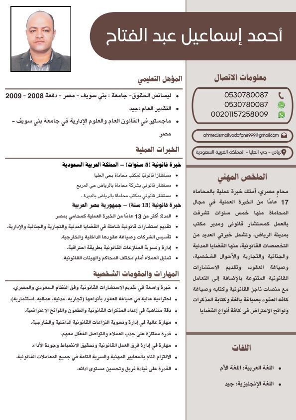 الاسم أحمد محامي مصري مستشار قانوني حاصل علي درجة الماجستير خبرة عملية بالمحاماة 17 عاما منها خمس سنوات تشرفت بالعمل كمستشار قانوني لعدد من مكاتب المحاماة وشركات المحاماة بمدينة الرياض وتشمل خبرتي في كافة التخصصات القانونية منها القضايا التجارية والمدنية والجنائية والأحوال الشخصية والعم لوصياغة العقود، وتقديم استشارات قانونية التعامل مع كافة المنصات القانونية منها منصة ناجز ومعين وتراضي ونافذ