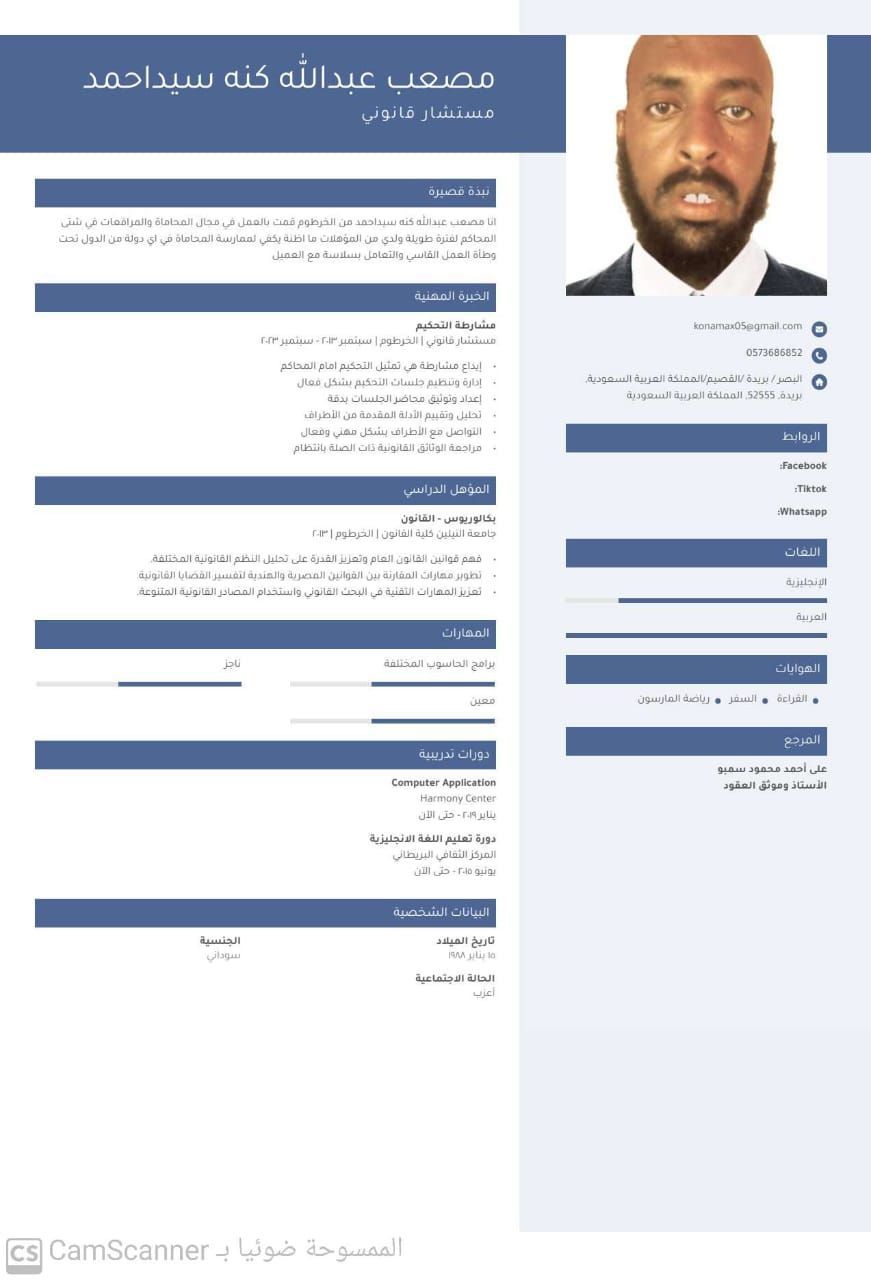 أنا مصعب عبدالله كنه سيد أحمد من الخرطوم محامي ومستشار قانوني عملت في السودان لأكثر من تسع سنوات كما عملت بالمملكة العربية السعودية لدي خبرة في كتابة جميع المذكرات المدنية الجزائية والشرعية والعمالية بمختلف درجات المحاكم من موضوع واستئناف ونقض ولدي خبرة بتطبيق ناجز