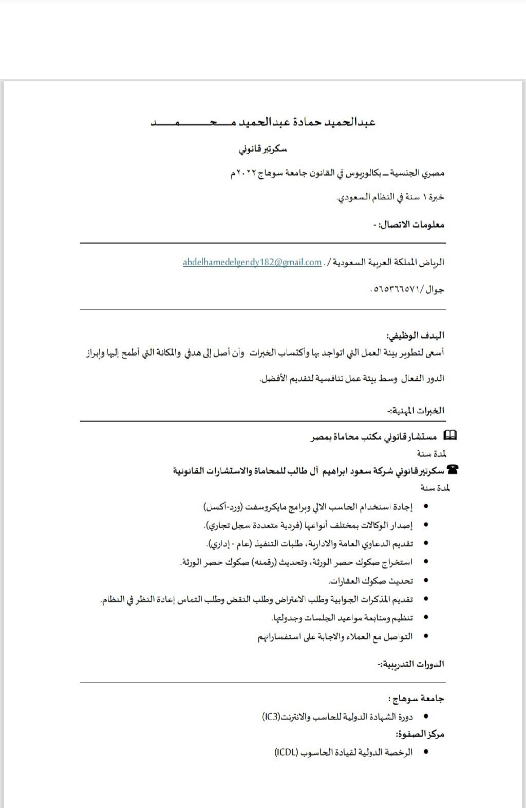 ابحث عن عمل سكرتير قانوني في شركة محاماة أو أي شركة آخري ولدي معرفة بالورد والاكسل