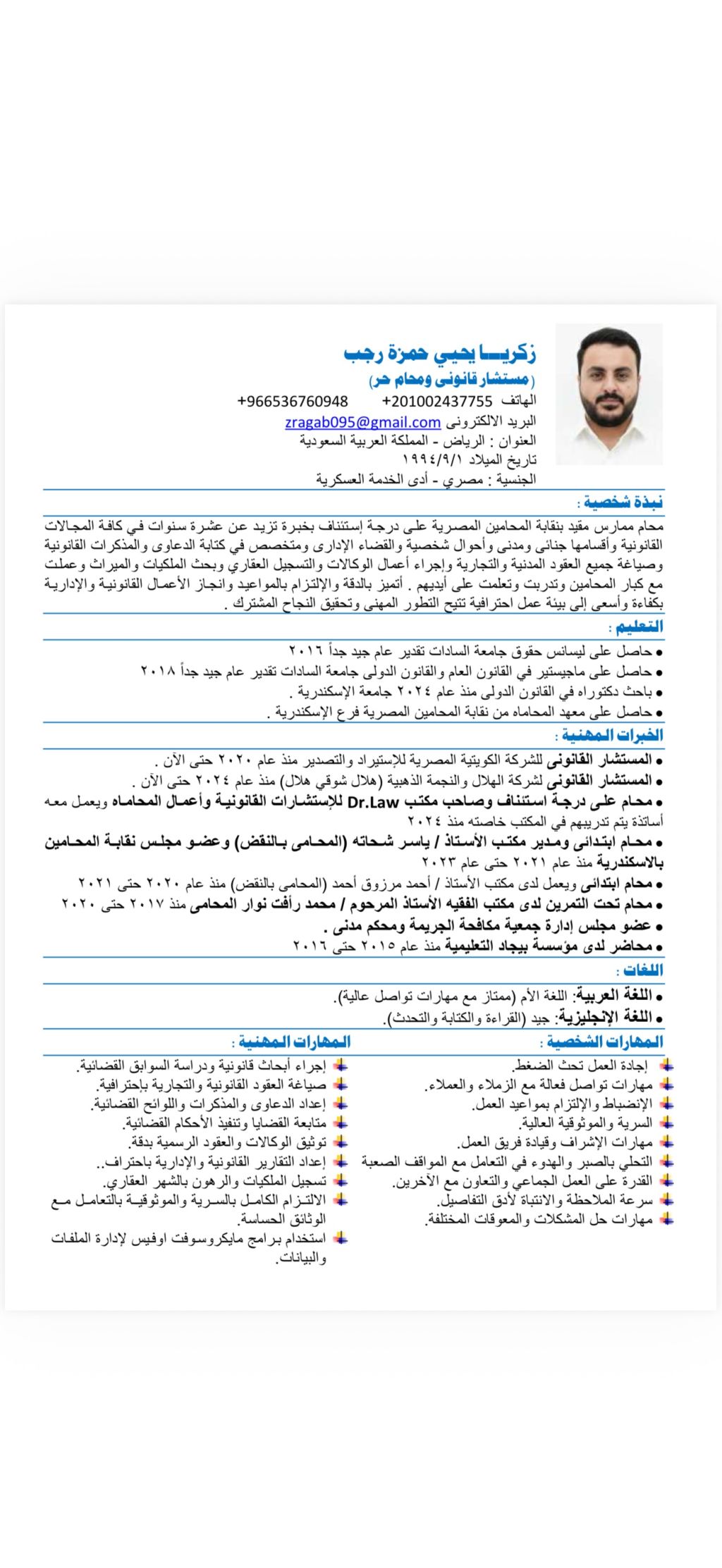 محام مصري علي درجه استئناف حاصل علي ماجستير في القانون العام والدولي مقيم في الرياض خبرة أكثر من 10 سنوات في صياغة ومراجعة العقود والاتفاقيات وتقديم الاستشارات القانونية للأفراد والشركات، عمل في القضايا التجاريه والعماليه والأحوال الشخصية والجنائية والادارية، بارع في اعداد المذكرات واللوائح القانونية ومتابعة الاجراءات القانونية والتمثيل أمام الجهات المختصه، واجادة التعامل مع منصة ناجز ملتزم بالمواعيد