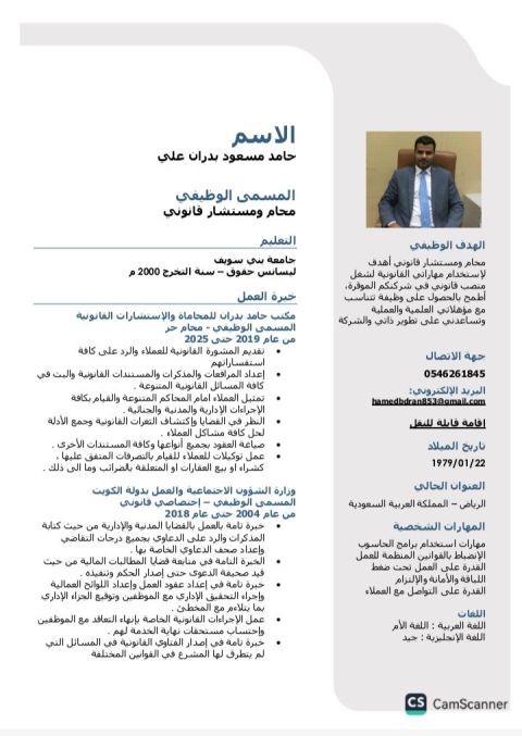 محامي مصري الجنسية حاصل على ليسانس الحقوق ابحث عن وظيفة في مكتب محاماة خبرة في مجال المحاماة من صياغة وكتابة المذكرات لكافة الدعاوى وكتابة العقود. مميزات اضافية / أجيد التعامل مع الأوفيس وكافة برامج الكمبيوتر وحاصل على بكالوريوس التجارة شعبة المحاسبه مما يتيح تنظيم وإدارة حسابات المكتب بجانب مهنة المحاماة أجيد البحث في مواد القانون للخروج بحلول وأتطلع الى ما هو جديد وموجود حاليا في السعودية