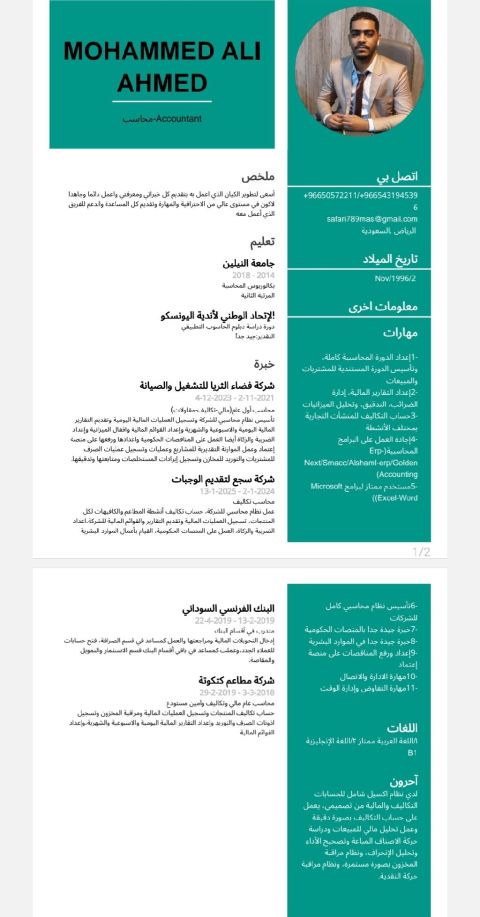 Looking for a job as a general accountant and head accou with a bachelor's degree, passionate and progressive in work Sudanese nationality, 29 years old, 5 years of experience in financial and cost accounting with commercial and contracting companies, good experience in government platforms, human resources and business management, Good English, have a valid residence permit and a driver's license