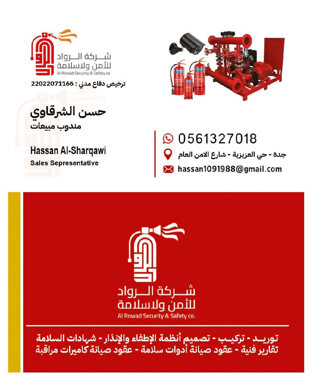 توريد وتركيب جميع اجهزة الانذار والاطفاء وعمل مخططات سلامه وتقديم شهادة المطابقه للدفاع المدني وعمل شهادة سلامة وعمل تقارير فوريه وغير فوريه وعمل عقود صيانة أدوات السلامة وفحص وصيانة جميع أنواع الطفايات وغرف fm200 وعقود صيانة كاميرات المراقبة