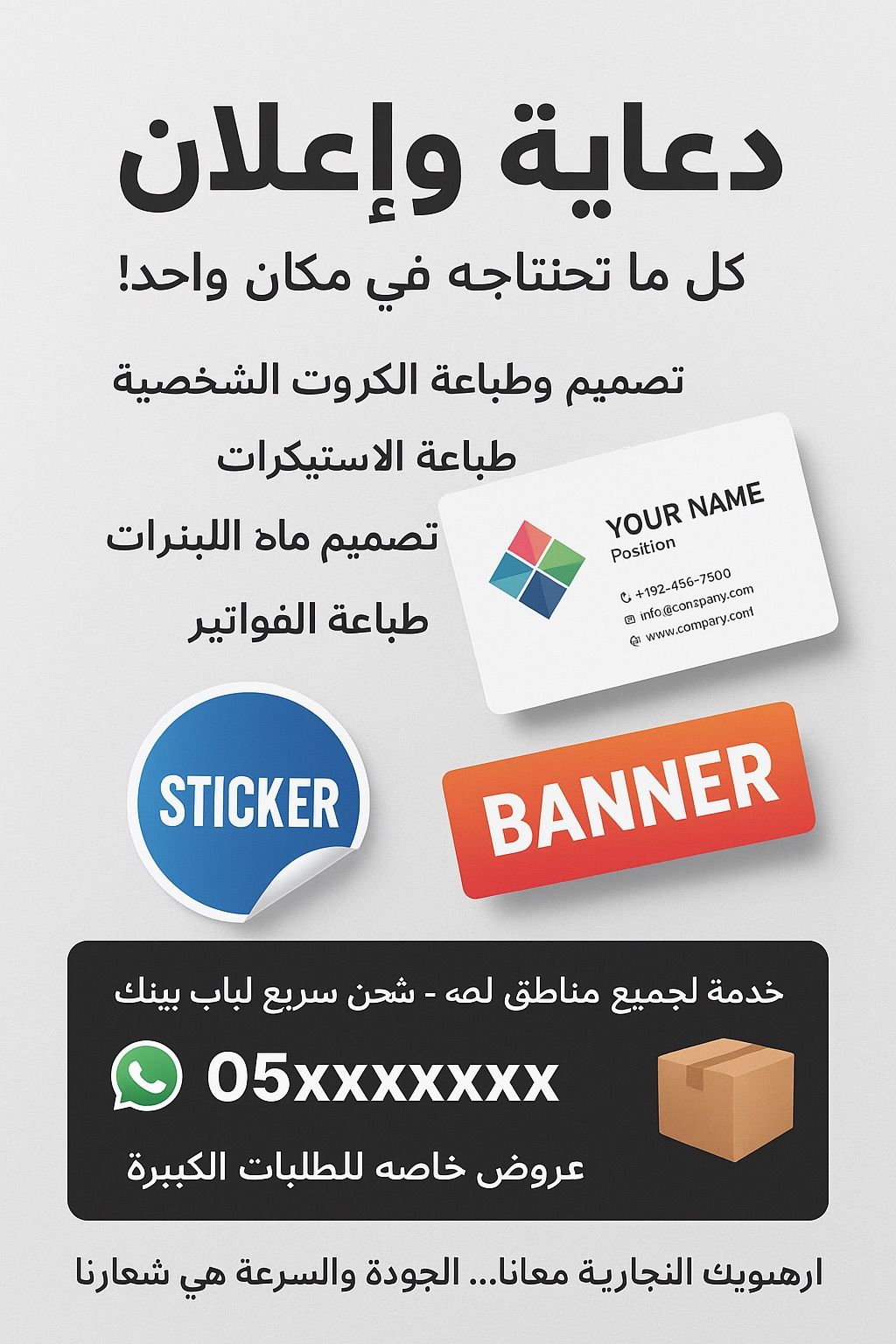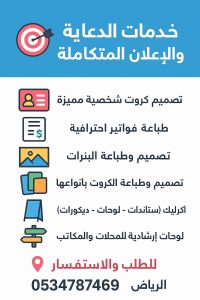 خدمات الدعاية والاعلان المتكاملة الخدمات تصميم كروت شخصية مميزة - طباعة فواتير احترافية - تصميم وطباعة البنرات - تصميم وطباعة الكروت بأنواعها - اكريليك (ستاندات - لوحات - ديكورات) لوحات ارشادية للمحلات والمكاتب للطلب والاستفسار