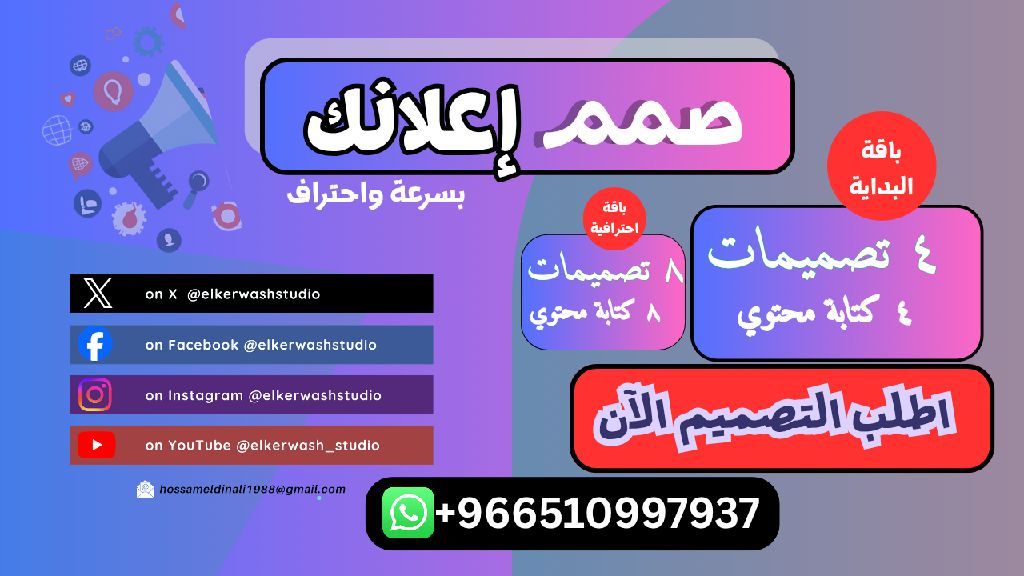 مصمم اعلانات وسوشيال ميديا محترف أقدم لك تصاميم اعلانية جذابة ومحتوى مكتوب باحتراف يساعدك توصل لعملائك وتزيد التفاعل والمبيعات. الخدمة تشمل تصميم اعلانات سوشيال ميديا (فيسبوك - انستجرام - الخ) كتابة محتوى اعلاني واضح ومقنع سرعة في التنفيذ والتزام بالمواعيد تعديلات بسيطة حسب الاتفاق الباقات المتاحة باقة البداية 4 تصاميم + 4 كتابات محتوى باقة احترافية 8 تصاميم + 8 كتابات محتوى