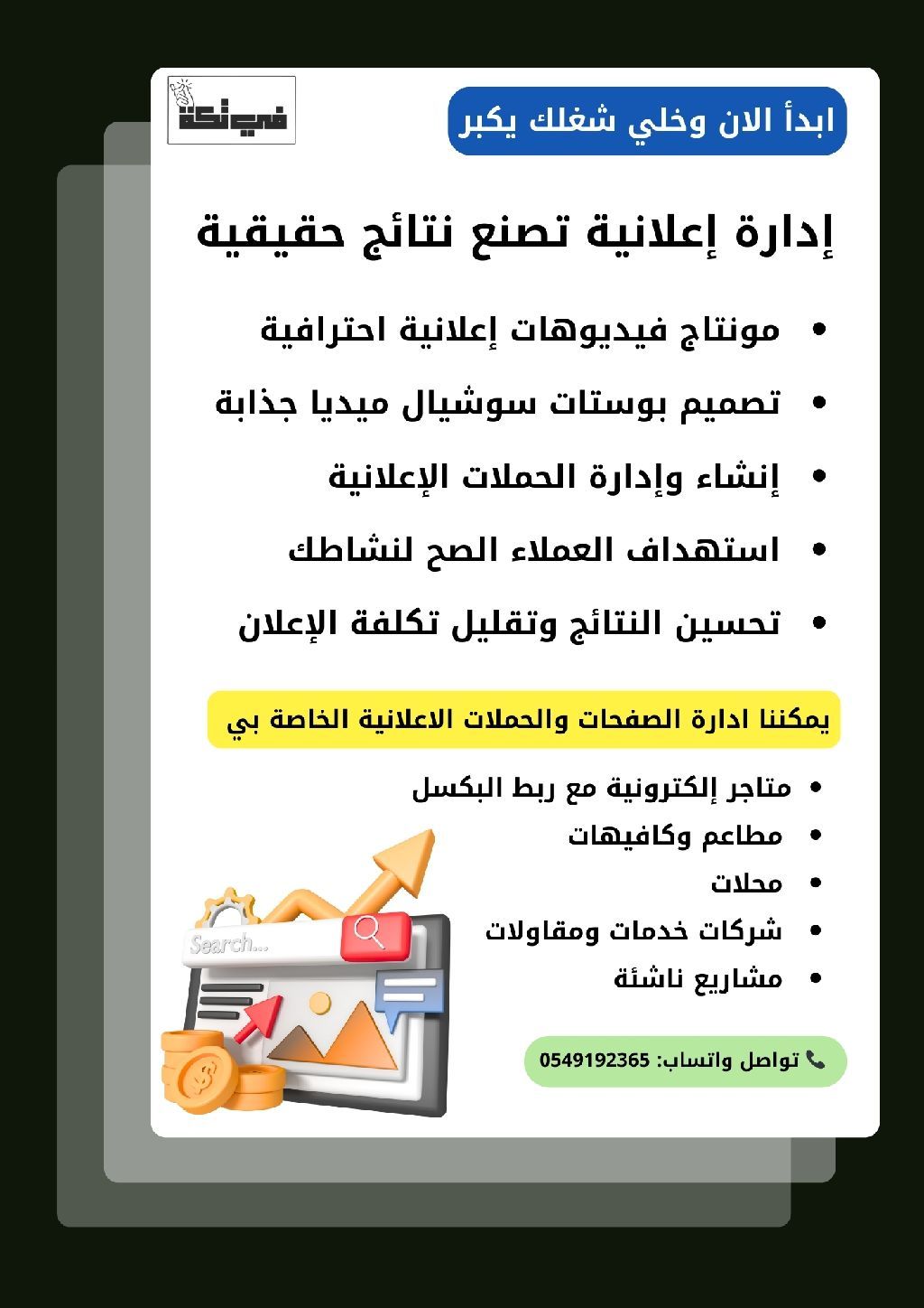 إدارة اعلانية تصنع نتائج حقيقية لنشاطك. بنقدم لك مونتاج فيديوهات اعلانية احترافية، تصميم بوستات سوشيال ميديا جذابة، وانشاء وإدارة الحملات الاعلانية مع استهداف العملاء الصح وتحسين النتائج وتقليل تكلفة الاعلان. مناسب للمتاجر الالكترونية، المطاعم، المحلات، وشركات الخدمات. اعلانك لازم يجيب عملاء ومبيعات مش مشاهدات بس. تواصل