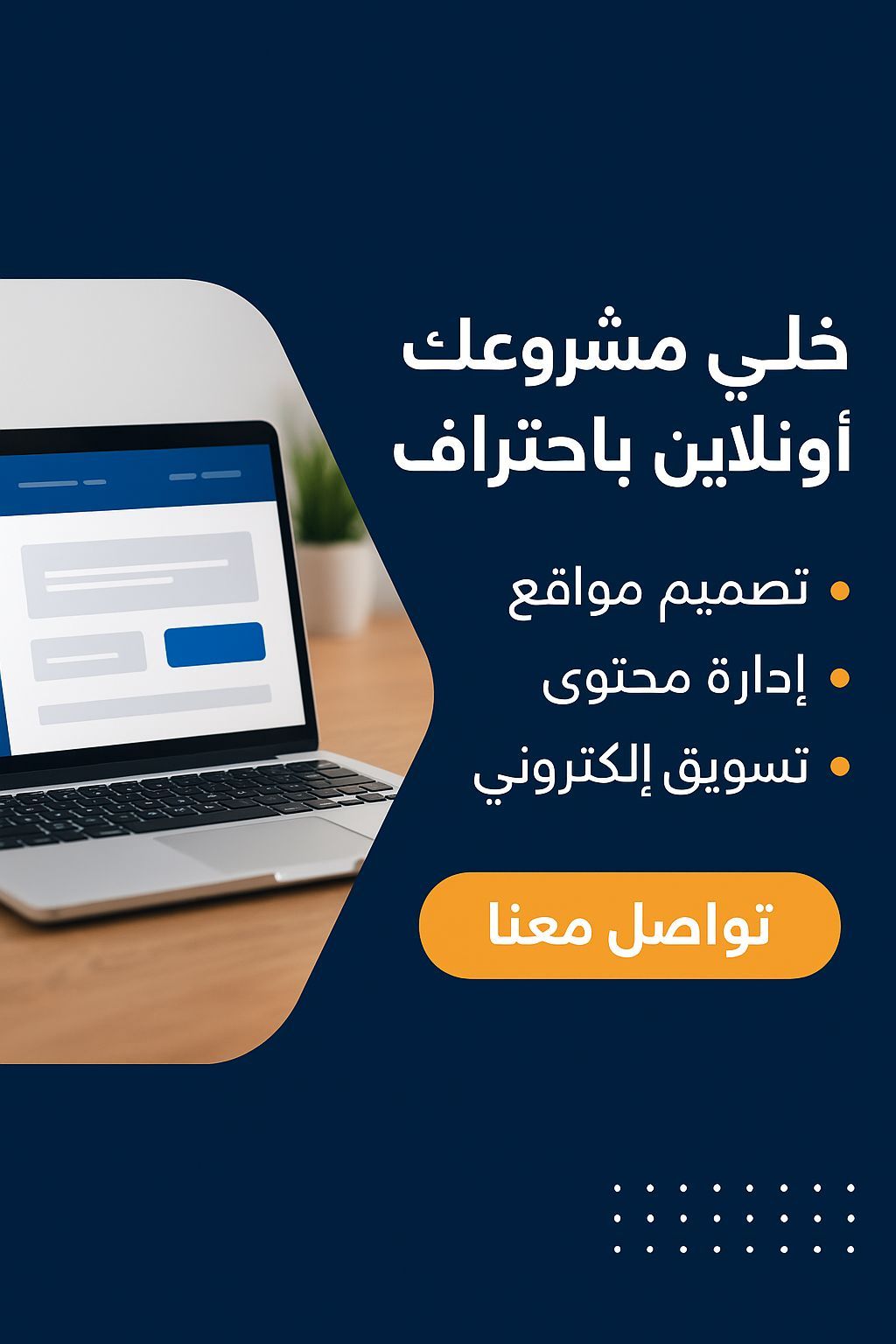 ودك مشروعك يبرز اونلاين نخدمك في تصميم المواقع، إدارة المحتوى، والتسويق الذكي. تواصل معنا وخلك جاهز للنجاح
