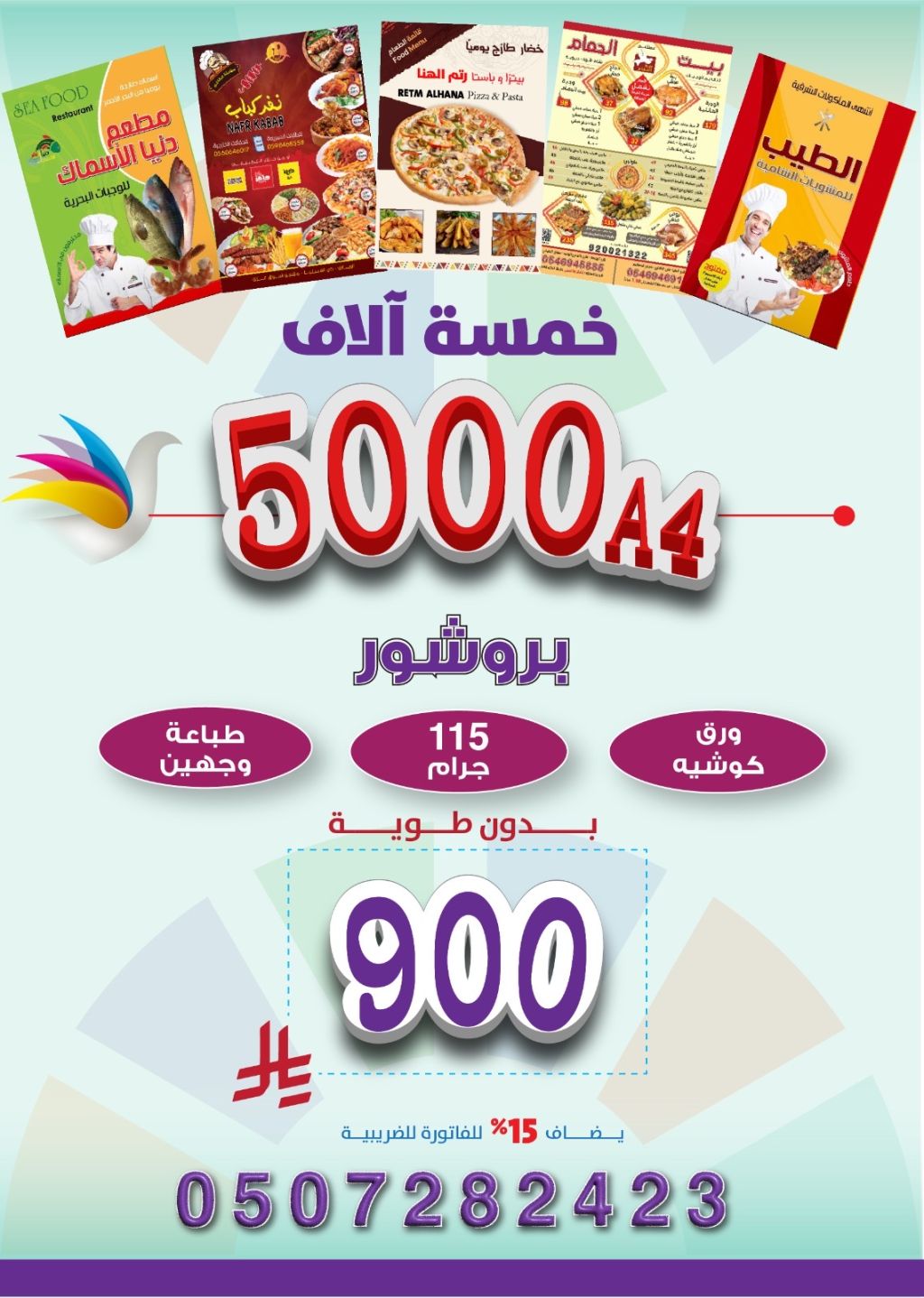 طباعة خمسة آلاف منيو مطعم A4 - 5000 الورق كوشيء 115 جرام (أبيض ناصع) جلوسي لامع أو مات مطفي - طباعة وجهين بدون طوية - تصميم جاهز ملف pdf من العميل - التوصيل داخل الرياض - أو الشحن مع المخرج لمدن المملكة - سعر تنافسي - 900 ريال غير شامل الضريبة + 50 ريال توصيل - أسعد بتواصلكم من خلال الواتساب لتنفيذ كافة أنواع الدعاية والاعلان