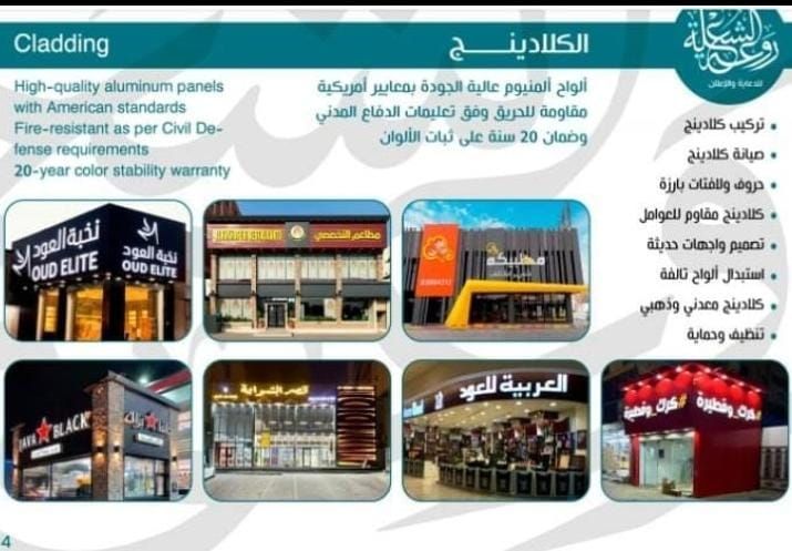 مؤسسة روعة الشعلة للدعاية والاعلان متخصصون في تركيب اللوحات الحروف البارزة والكلادينج وأعمال الزجاج. تركيب وشد بنرات المشاريع - تركيب لوحات مشاريع - تصميم وطباعة الإستيكرات - صيانة وتصليح جميع أنواع اللوحات - هديا بشعاركم حسب الطلب أسعار مناسبة مع الجودة