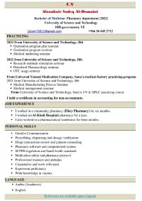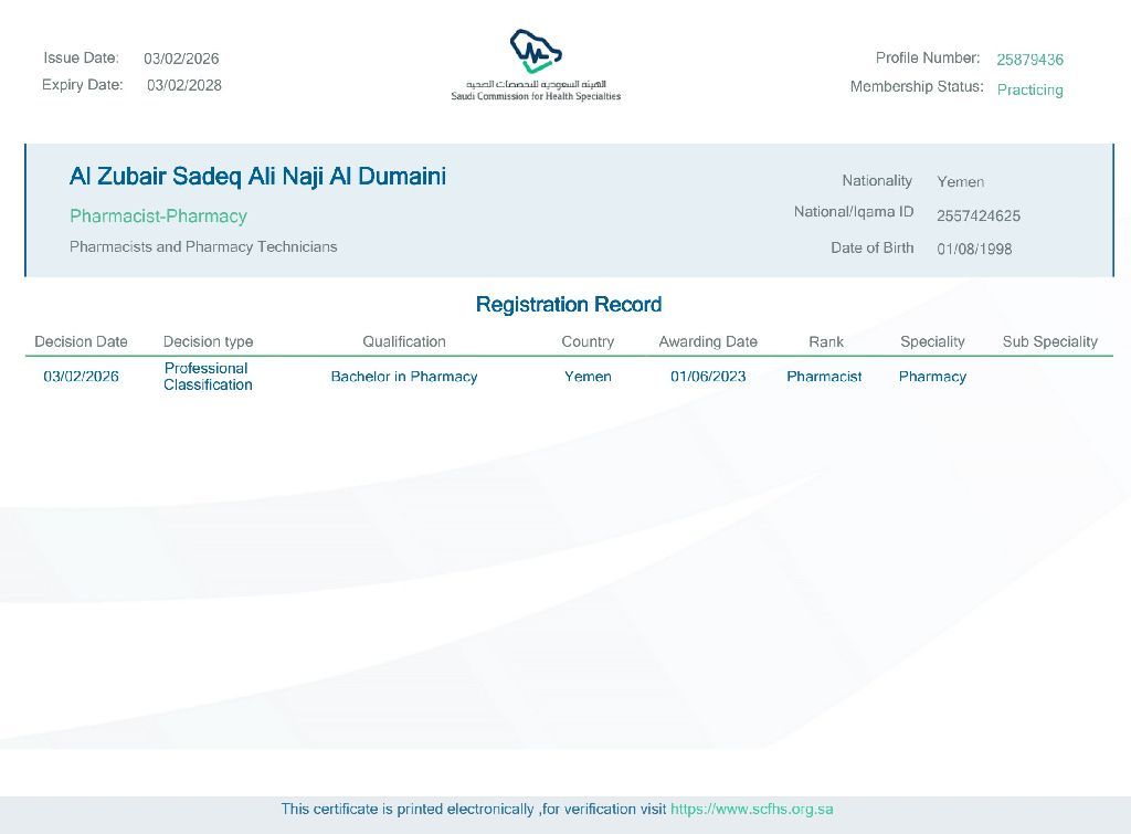 Zubair Sadeq Ali Naji Al - Dominy صيدلي مرخص من الهيئة السعودية للتخصصات الصحية (SCFHS) بخبرة في صيدليات المجتمع وإدارة العمليات في بيئة عمل عالية الضغط. ساهم في زيادة المبيعات بنسبة 50% من خلال التسويق الفعال لمنتجات OTC والمكملات، مع الالتزام التام بسلامة المرضى ودقة صرف الوصفات. يمتلك خبرة في معالجة مطالبات التأمين، ضبط المخزون، تقليل الهدر، وتحسين تجربة العملاء. والحفاظ على الجودة الدوائية