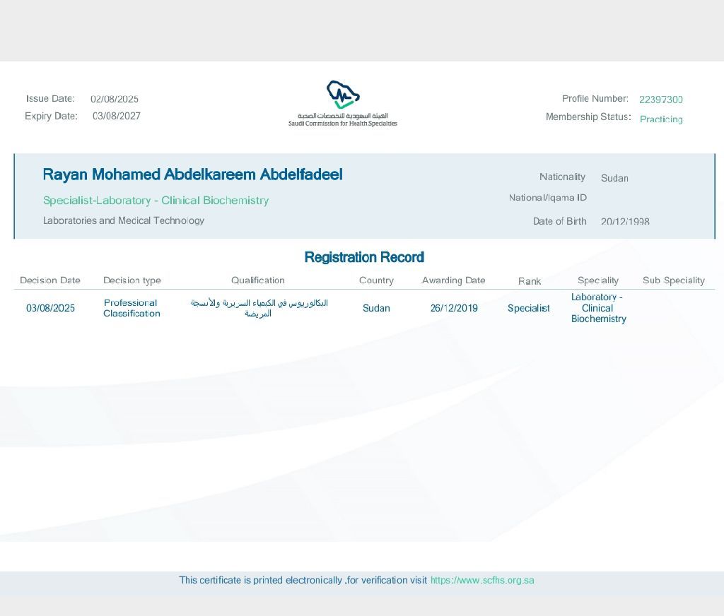 أنا أخصائية مختبرات طبية حاصلة على درجة الماجستير في قسم الكيمياء السريرية وعندي كرت الهيئة لي خبرة في المجال لمدة 5 سنوات وخبرة داخل المملكة
