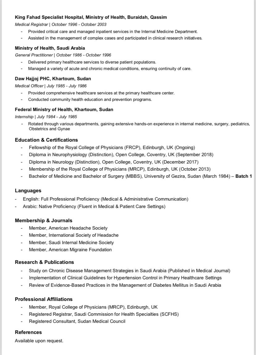 أخصائي أول الطب الباطن والأعصاب مصنف من الهيئة السعودية بتصنيف بنائب، كذلك زميل الكلية الملكية للأطباء الباطنة في (إدنبره) مسجل ومصنف من قبل المجلس الطبي الايرلندي. للترخيص فقط أو العمل. الرجاء التواصل على الرقم التالي