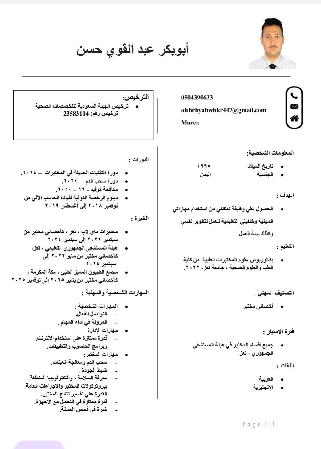 أبو بكر عبد القوي حسن محمد / أخصائي مختبر / حاصل على تصنيف الهيئة السعودية للتخصصات الصحية / خبرة 4 سنوات/ في اليمن والسعودية