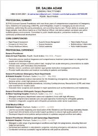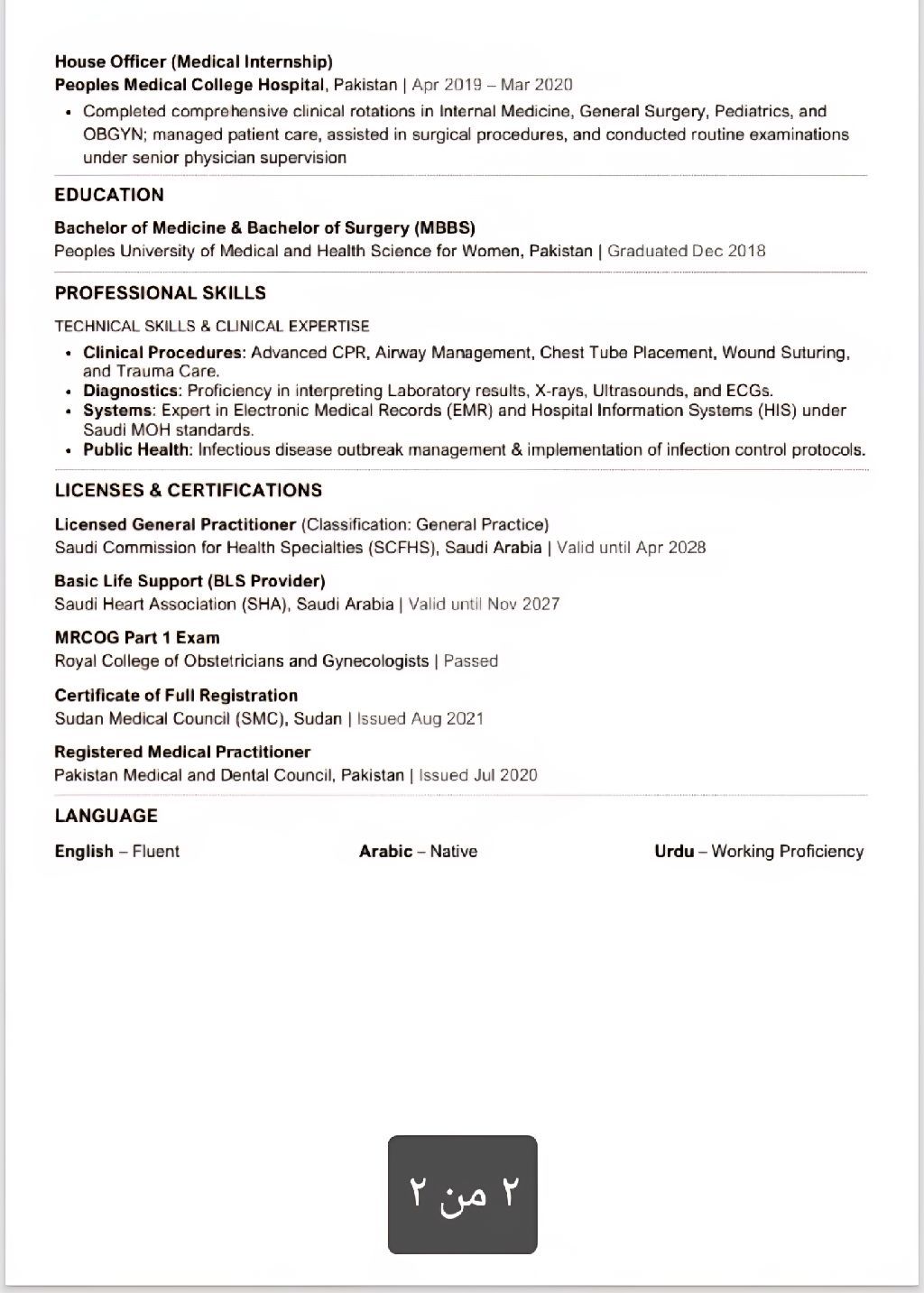 طبيبة عامة مقيمة مرخصة من الهيئة خبرة ثلاثة سنوات في الطوارئ والنساء والجراحة متميزة في التعامل مع أنظمة EMR ومعايير وزارة الصحة. أتقن العربية والانجليزية والأوردو بطلاقة. حاصلة على MRCOG 1. خبيرة في الإنعاش القلبي والاجراءات الجراحية الصغرى مهارة عالية في إدارة الحالات الحادة والمزمنة بدقة مهنية. ومتابعة الحمل والولادة وتقديم رعاية طبية متكاملة متاحة للنقل