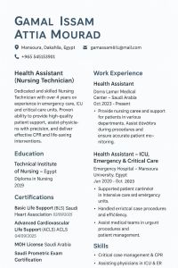 الاسم جمال عصام عطية مراد. مصري فني تمريض مرخص من هيئة التخصصات حاصل علي البرومترك وحاصل علي MOH وBLS وACLS ودورة أل CPR خبرة 5 سنوات في مجال العناية المركزة والطوارئ والحالات الحرجة والعمل داخل المملكة العربية السعودية لمدة عامين في العيادات الخارجية حاصل علي رخصة قيادة خصوصي
