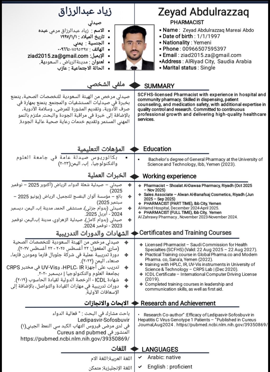 صيدلي مرخص من الهيئة السعودية لتخصصات الصحية جاهزه لنقل الكفالة والعمل