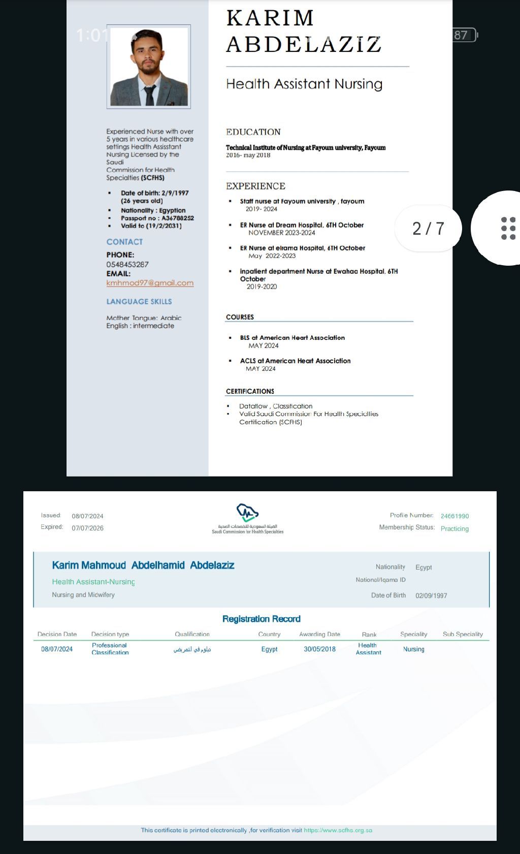 أنا كريم محمود عبد الحميد عبد العزيز مساعد صحي عندي خبرة في المملكة سنة في مجال الرعاية المزلية. عندي خبر 5 سنين في قسم الطوارئ عندي خبرة سنة في مجال تمريض الأسنان ابحث عن شاغر وظيفي. معي BLS. ACLS. معي رخصة قيادة في حالة العمل في شركة للزيارات المنزلية التي أمضيت فيها عام كامل من خدنه عملاء TOP VIP