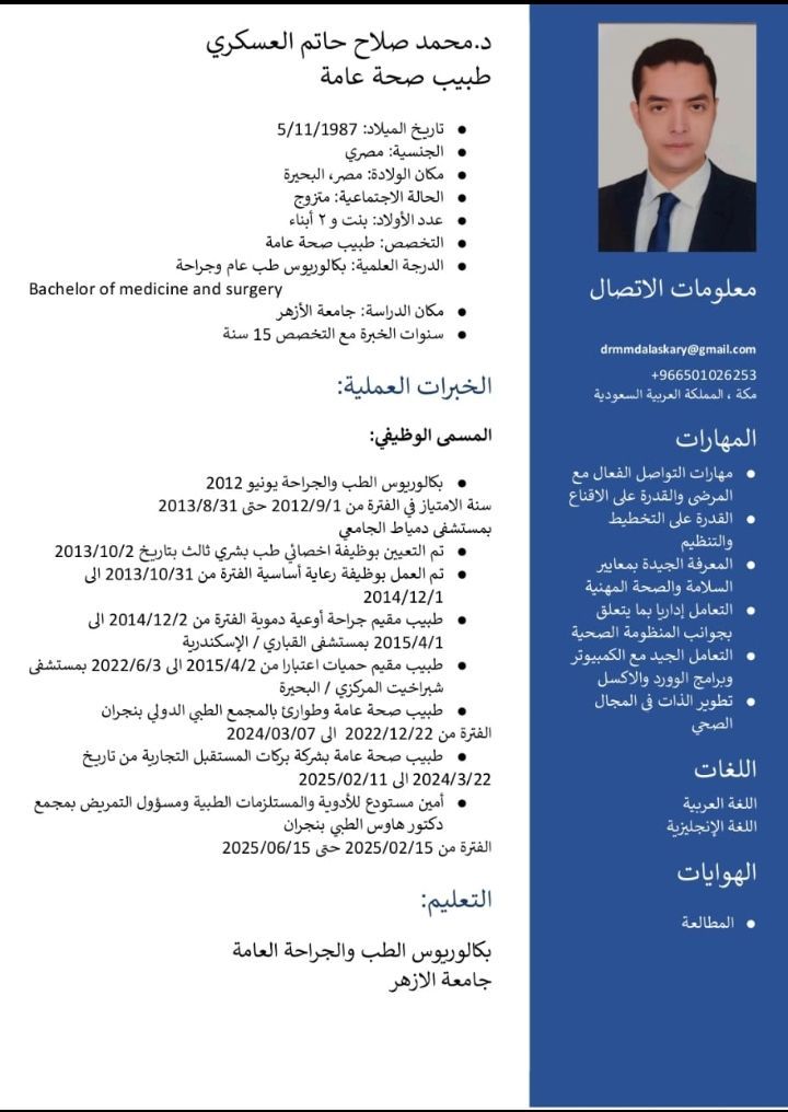 طبيب صحة عامة مصري جامعة الأزهر 38 عام خبرة بالمستشفيات طبيا واداريا ما يقرب من 15 عام. بدون تصنيف حاليا ابحث عن فرصة عمل في مستشفى خاصة أو في المجال الطبي (عمل اداري. سكرتير طبي تأمين طبي. مستودع ادوية. مستلزمات طبية) متواجد داخل المملكة