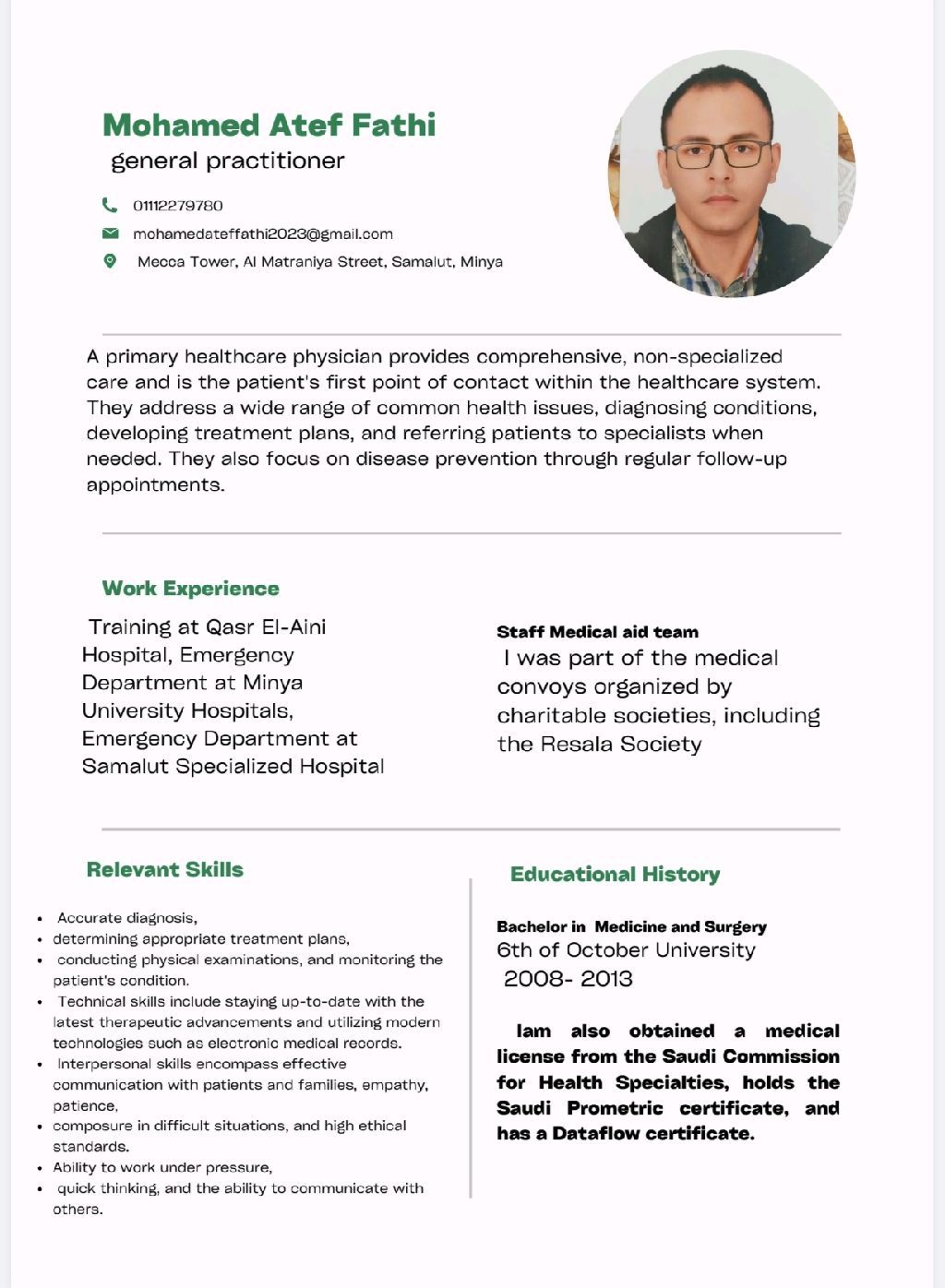 طبيب عام خبرة 10 سنوات خبرة واسعة في التشخيص والعلاج والرعاية الصحية الأولية مهارات ممتازة جدا في التعامل مع المرضي وإدارة الحالات الطارئة، عملت في مجالات طبية متنوعة بالمستشفيات والمستوصفات، لدي تصنيف الهيئة جاهز للعمل والانضمام فورا