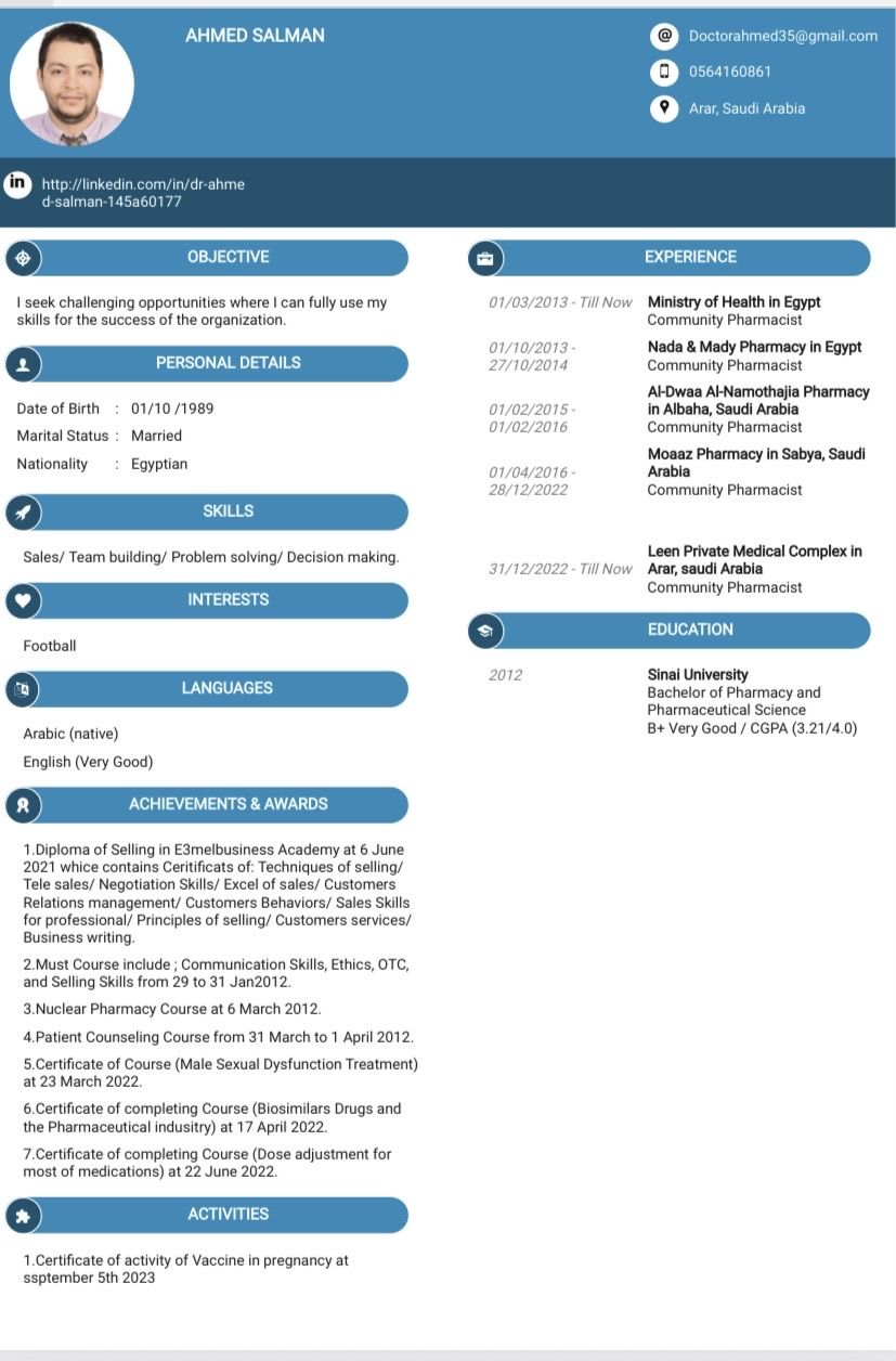 صيدلي مصري خبرة 10 سنوات في المملكة مقيم في عرعر ومتاح لنقل الكفالة حاليا مرخص وإقامة سارية وكارت التخصصات ساري وجاهز للعمل في أي منطقة في المملكة